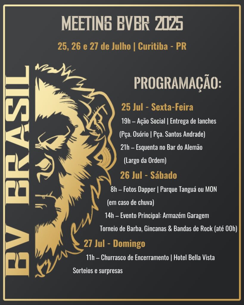 SALUTE, nação! Junho foi um mês de muitas preparações. Estamos agora a menos de um mês do 10º MEETING de ANIVERSÁRIO da BVBR e, vai por mim, se você ainda não confirmou sua presença, aproveita que acabou de sair a PROGRAMAÇÃO OFICIAL de eventos e confere tudo o que vai estar perdendo. De 25 a 27 de JULHO., sexta a domingo, serão três dias intensos em CURITIBA celebrando o CHAPTER BRASIL e a primeira década de BEARDED VILLAINS em nosso país. Se programe e não fique fora dessa, a BV BRASIL espera por você!