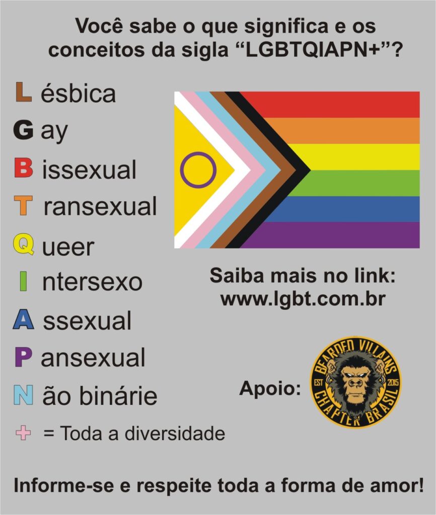 Mudando de assunto, no sábado, 28/6, foi celebrado o DIA DO ORGULHO LGBTQIAPN+, registro da luta por visibilidade e respeito às pessoas LGBTQIAPN+ e também a memória da Revolta de Stonewall que, em 1969, representou um ponto de virada na luta por direitos civis da população LGBTQIA+. Fundamentalmente, a BEARDED VILLAINS se coloca contra a violência, o preconceito e as desigualdades, independente de suas formas. Portanto, a BV BRASIL também apoia causas e ações contra a LGBTQIA+fobia, o preconceito, a hostilidade, a exclusão ou agressão contra pessoas em razão de sua identidade de gênero ou orientação sexual. Não há como ser um de nossos barbudos e, ao mesmo tempo, ser conivente com preconceitos.